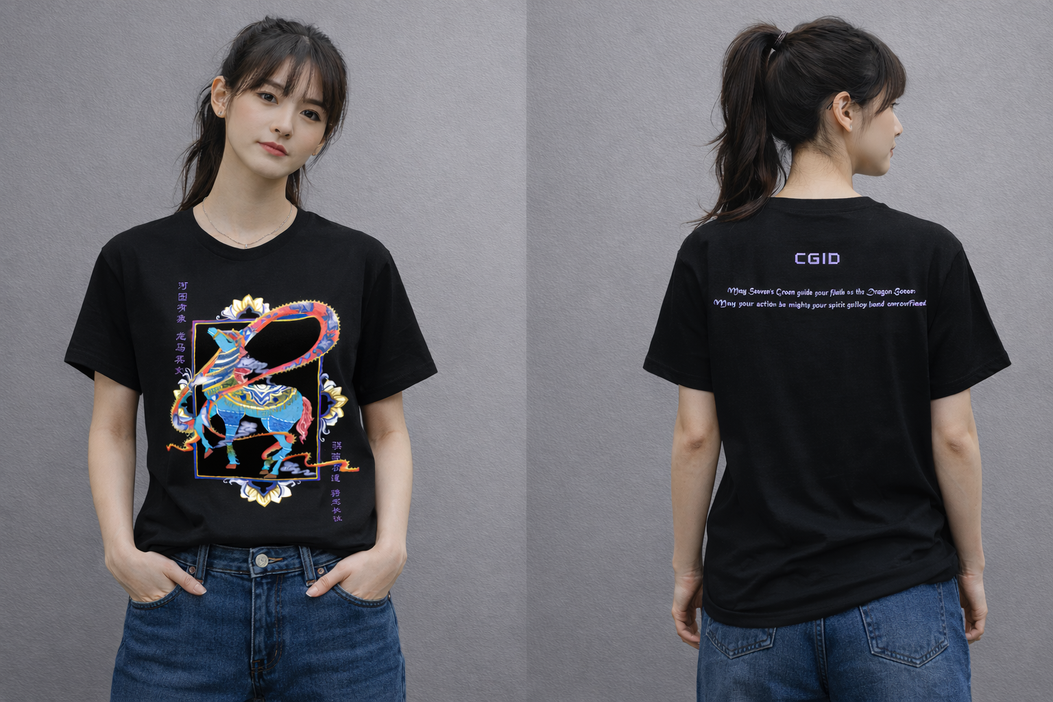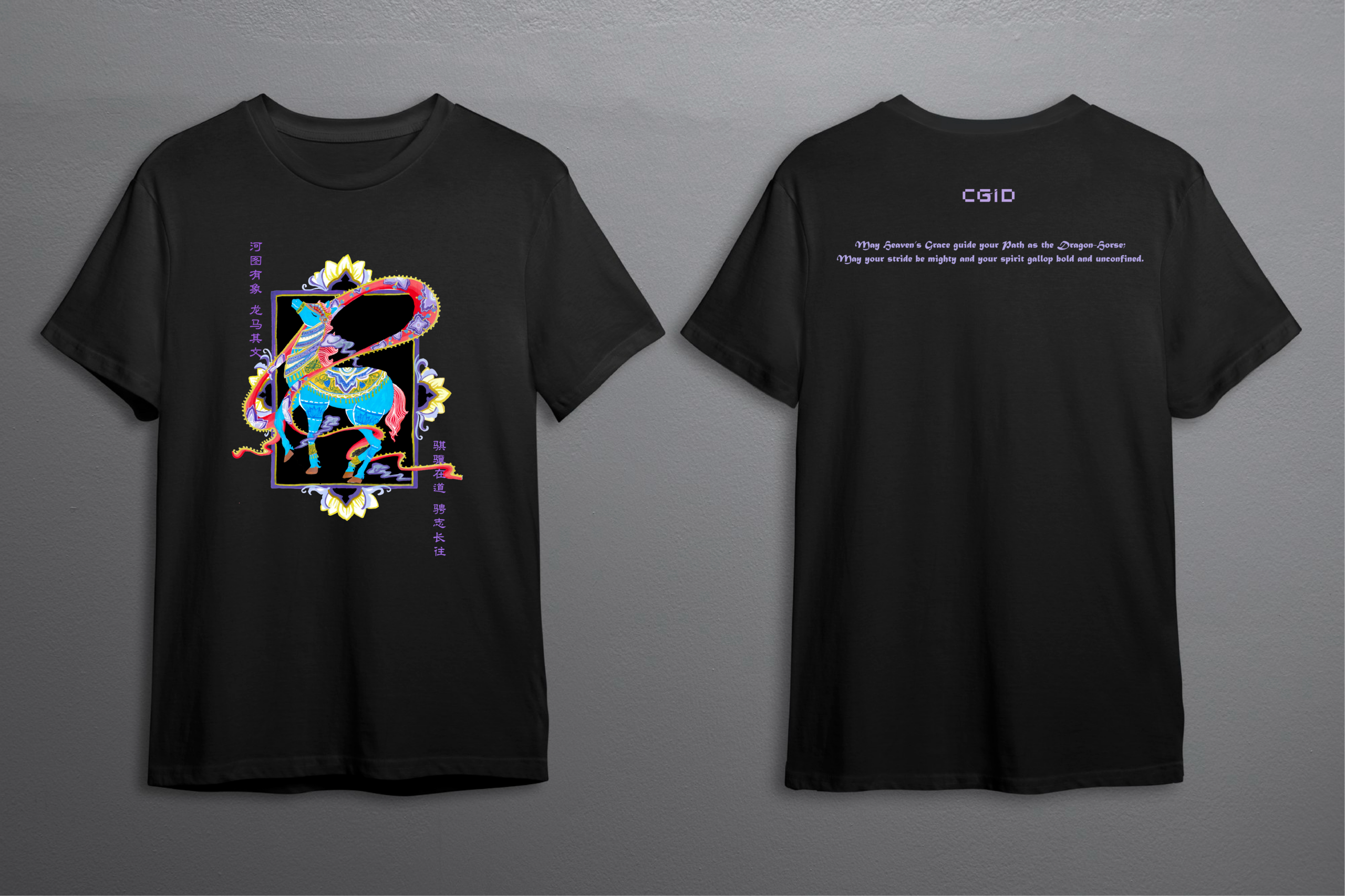 Dieses schwarze T-Shirt vereint ausdrucksstarkes Design mit der kraftvollen Symbolik des chinesischen Jahres des Pferdes. Das detailreiche, farbintensive Motiv auf dunklem Hintergrund erzeugt einen starken visuellen Kontrast und verleiht dem Shirt eine moderne, fast künstlerische Wirkung.